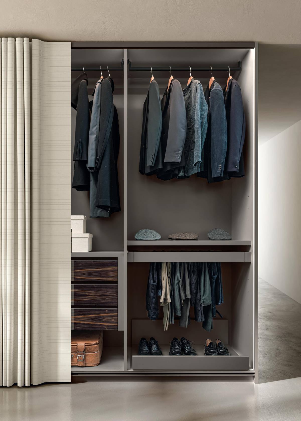 Le armoire Et Voilà, fruit d’un projet extrêmement innovant, s’ouvre d’un simple geste pour ensuite se fondre dans l’architecture : en effet, un tissu tendu de grandes dimensions remplace les portes et élimine la perception du armoire, qui devient une paroi textile raffinée. Réalisable au millimètre près, il permet de changer facilement le look de la pièce et contribue au confort sonore grâce à ses propriétés phono-isolantes et au fonctionnement silencieux de son mécanisme de coulissement.
