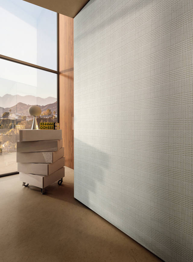 Le tissu, souple et raffiné, possède une âme technique et une trame qui empêche la poussière de filtrer à l'intérieur et garantit une absorption sonore qui rend les espaces doux et ouatés.